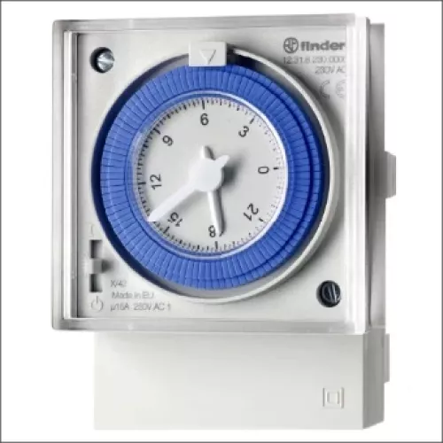 FINDER Schakelklok Analoog, Frontmontage 72x72, 1-kanaals, Voedingsspanning 230VAC, Wisselcontact (NO/NC), Nom. Schakelstroom 16A bij 250VAC, Dagprogramma, 2-modulen breed,