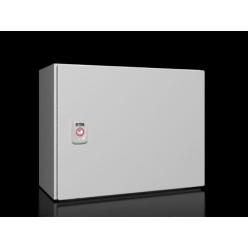 AX Wandkast, met 1 deur, 380x300x210 mm BxHxD, plaatstaal, RAL 7035, met montageplaat en wartelplaat onder, knevelsluiting (dubbelbaard)Omschrijving